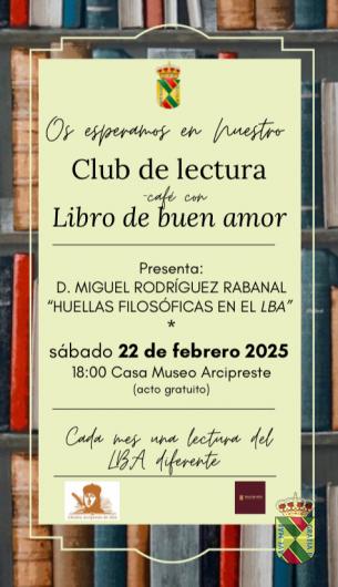 Se va a celebrar un nuevo encuentro del Club de Lectura del Libro de Buen Amor. En esta ocasión, Miguel Rodríguez Rabanal, profesor de Filosofía, será el ponente encargado de ofrecer su visión y conocimientos sobre esta obra literaria bajo el título "Huellas filosóficas en el Libro de Buen Amor". El acto, que está incluido dentro de las actividades programadas por la Cátedra Arcipreste, será gratuito al igual que en ocasiones anteriores.